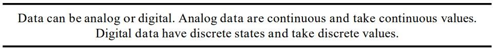 Data can be analog or digital. The term analog data refers to information that is continuous; digital data refers to information that has discrete states. For example, an analog