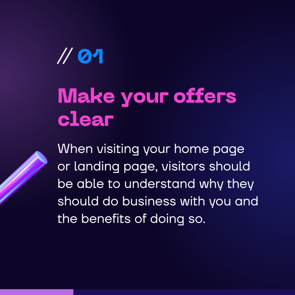 When visiting your home page or landing page, visitors should be able to understand why they should do business with you and the benefits of doing so.