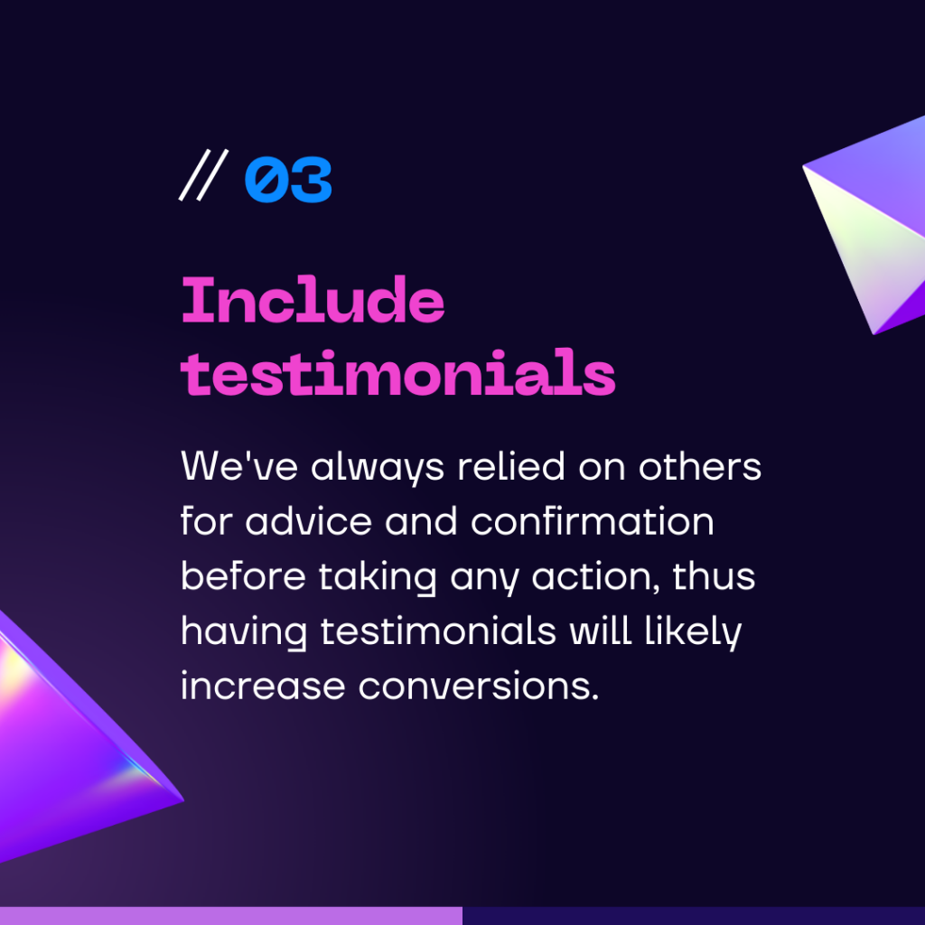 We’ve always relied on others for advice and confirmation before taking any action, thus having testimonials will likely increase conversions.