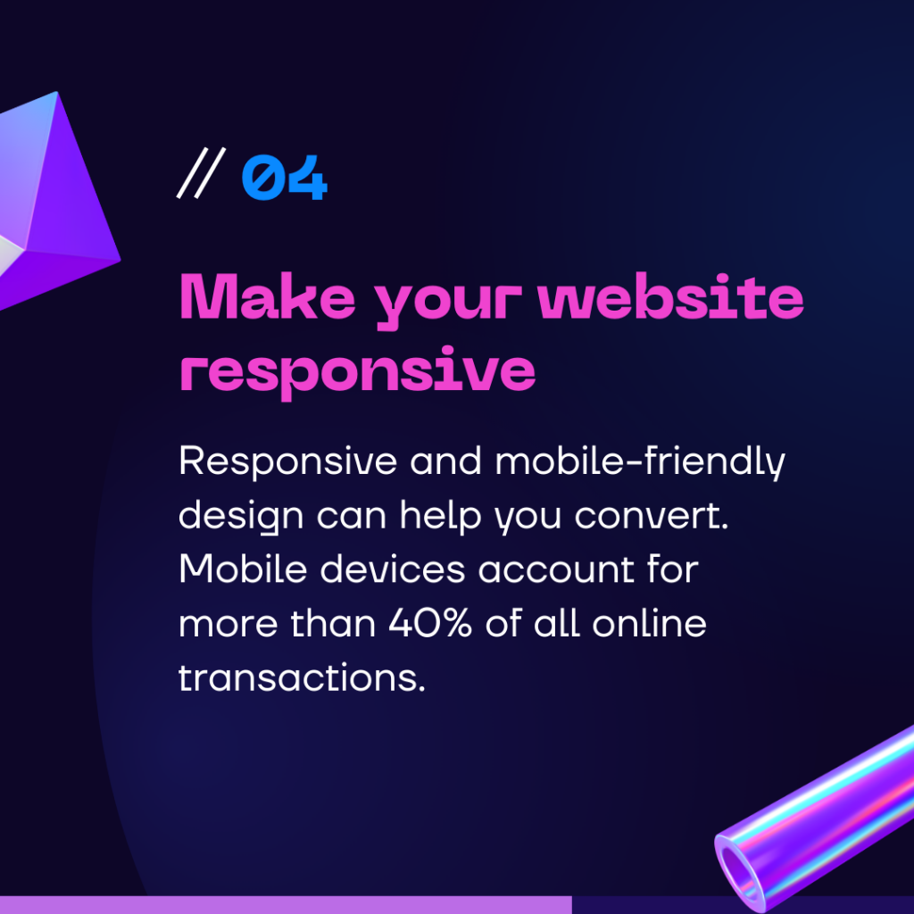 Responsive and mobile-friendly design can help you convert. Mobile devices account for more than 40% of all online transactions.