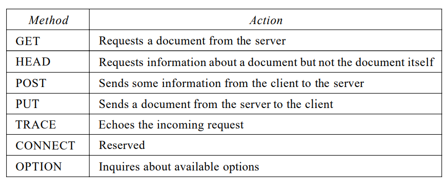 Request type. This field is used in the request message. In version 1.1 of HTTP, several request types are defined. The request type is categorized into methods as defined in Table.