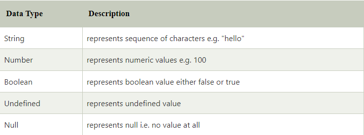 JavaScript is a dynamic type language, means you don’t need to specify type of the variable because it is dynamically used by JavaScript engine. You need to use var here to specify the data type. It can hold any type of values such as numbers, strings etc. For example: